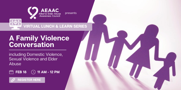 We are excited to announce we will be hosting a series of virtual, monthly Lunch and Learn sessions throughout the year – each session exploring a different theme related to elder abuse, relationships and family violence and facilitated by leading professionals dedicated to increasing awareness and response to elder abuse in communities across Alberta.