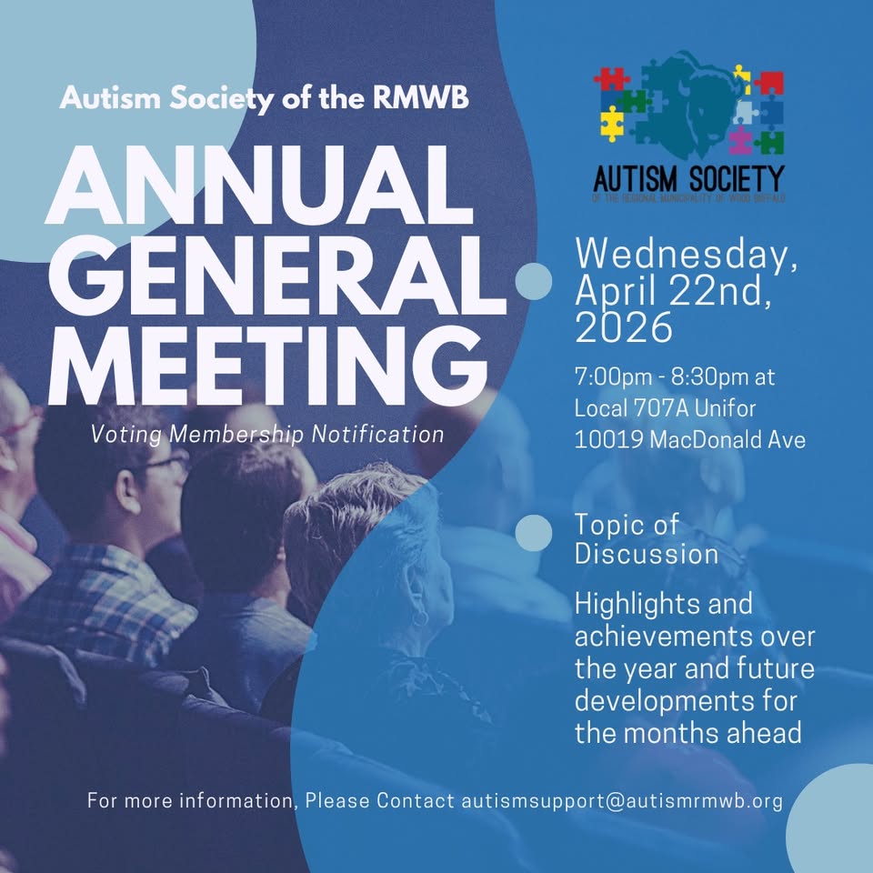 You are invited to attend the Annual General Meeting of the Autism Society of the Regional Municipality of Wood Buffalo.