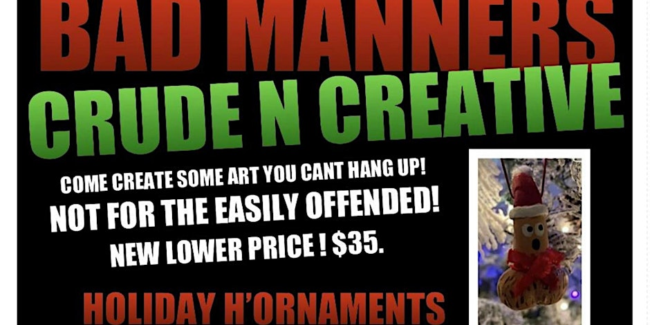 Come Join us at Baileys Pub for our BAD MANNERS CRUDE N CREATIVE Holiday H’Ornaments edition! ! Renee Manners, an Artist that is also a Comedian! We plan to Drink, Eat, Paint, and let loose! This will be an Adult only event! Not fit for those who are easily offended! Comedy! Door Prizes! Drink Specials! Supplies & More will all be included with your ticket! This event is expected to sell out! Contact Renee Manners to reserve your table!