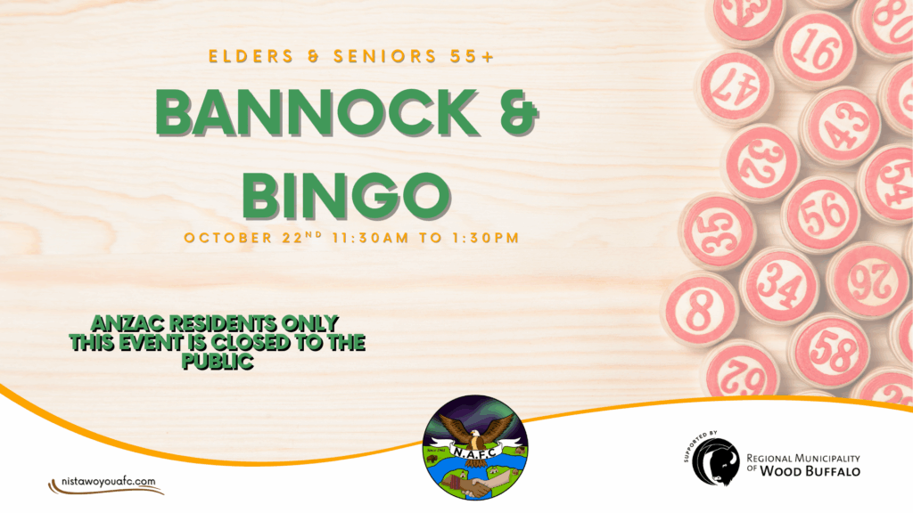 The Nistawoyou Association Friendship Centre welcomes Elders and Seniors living in the community of Anzac to join us for a Bannock and Bingo event from 11:30am to 1:30pm. A bannock-themed meal will be provided along with exciting bingo games and prizes. For those who do not wish to play bingo, a small craft table will be available. Transportation will be provided to and from Anzac. This program has 30 spots available and is open to Anzac residents only. Registration is required through AFCSS at office@anzacfcss.com. This event is closed to the public.