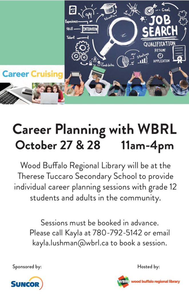 Wood Buffalo Reginal Library will be at the Therese Tuccaro Secondary School to provide individual career planning sessions with grade 12 students and adults in the community.