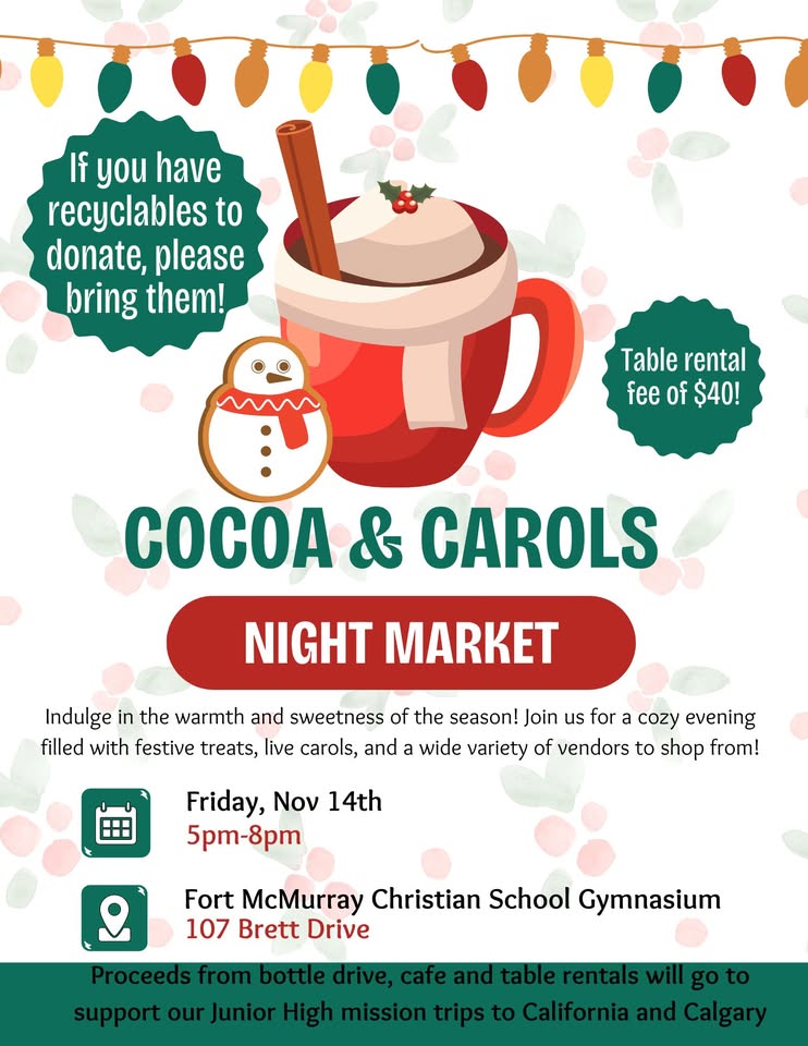 Join us for our Cocoa & Carols Night Market! Enjoy local vendors, festive treats, and beautiful Christmas music — all while supporting our Junior High Mission Trips. Tables are $40 to rent, and entry for shoppers is by a donation of recyclables (if possible).