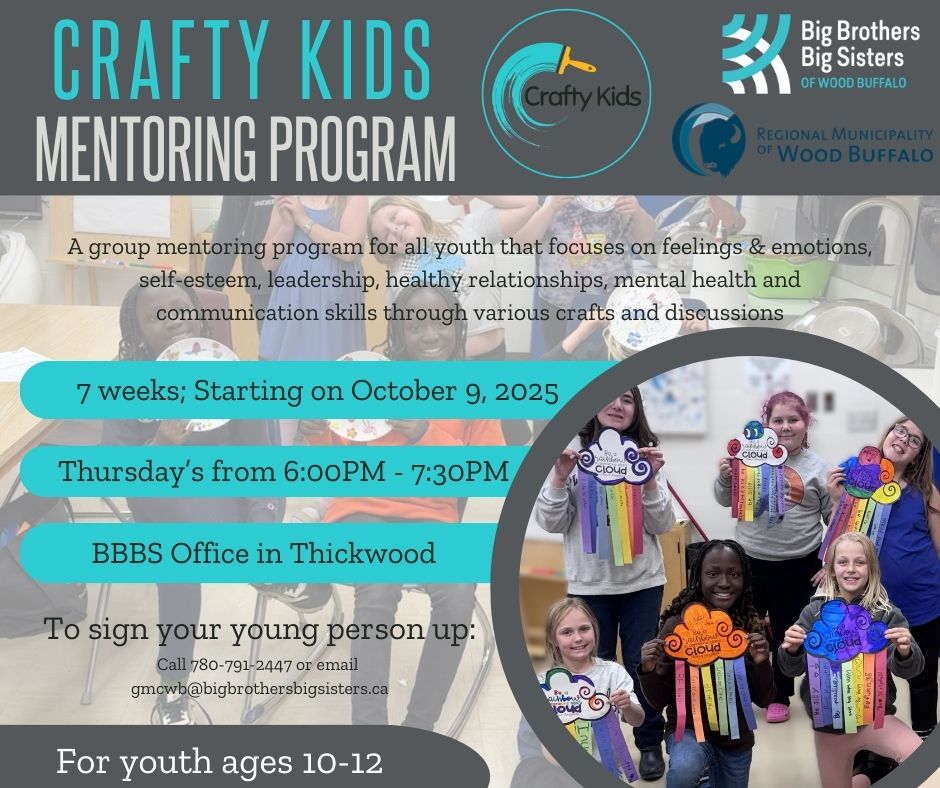 Our Crafty Kids Mentoring Program kicks off October 9 for 7 weeks from 6:00PM – 7:30PM at our office in Thickwood.