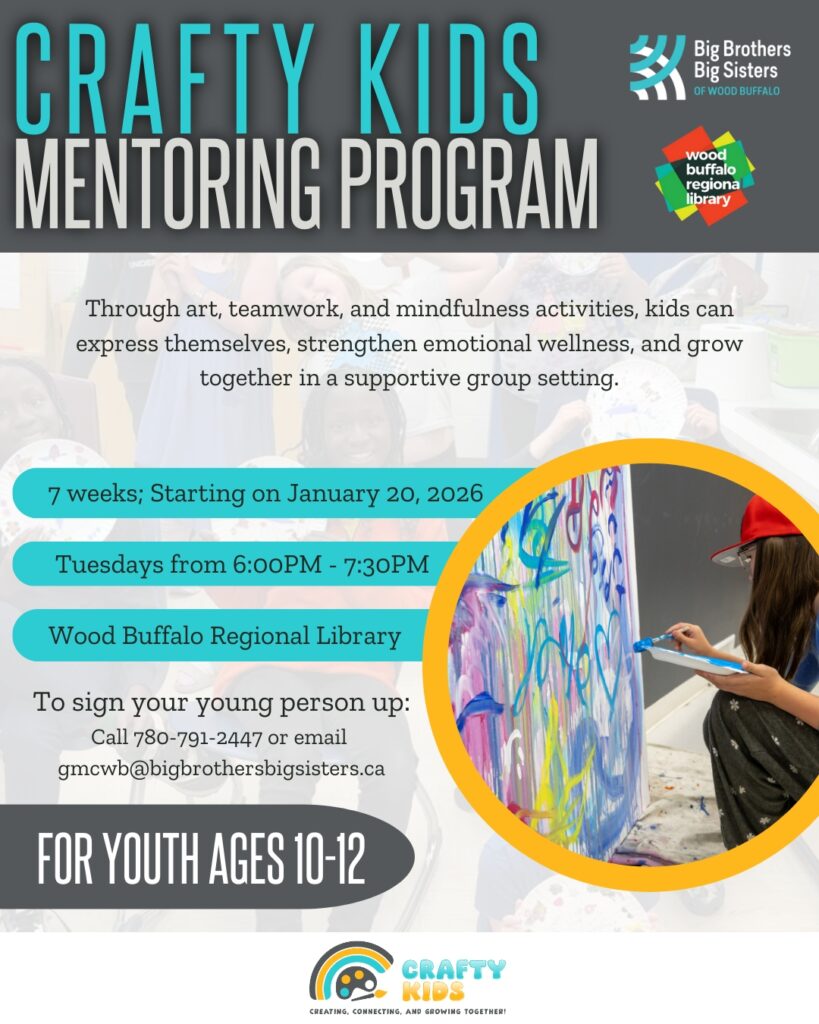 We’re excited to launch our first Crafty Kids at the Wood Buffalo Regional Library, a fun and creative group mentoring program designed to help kids build confidence, communication, leadership, and healthy relationships.