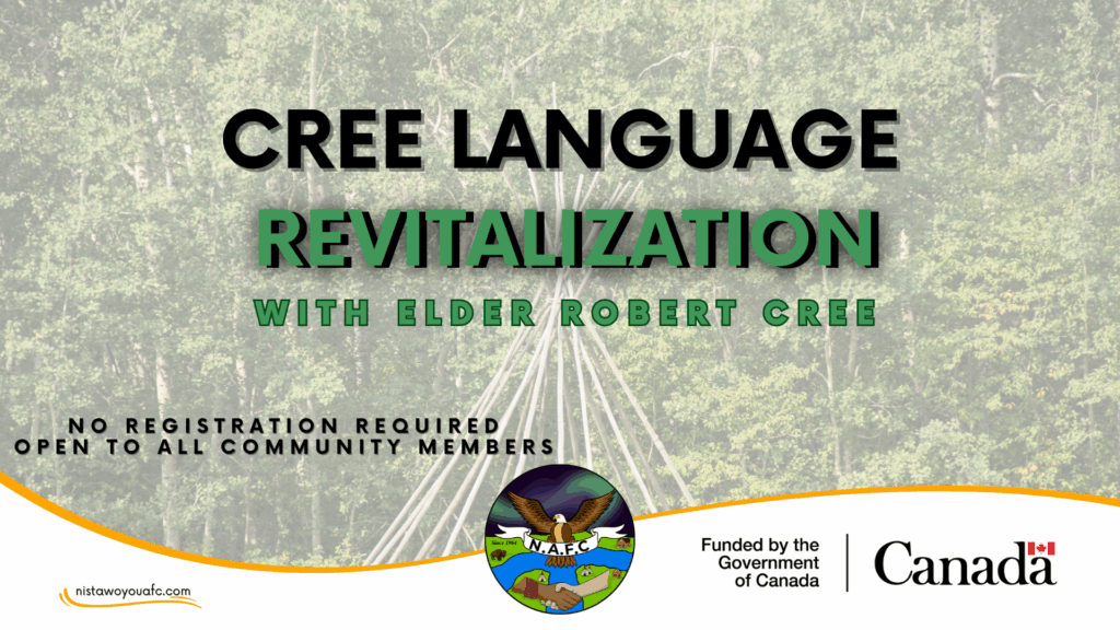 Come spend a morning learning Cree with Elder Robert Cree! Whether you’re a beginner or simply want to learn a few local words, join us to connect, learn, and explore ways to bring Cree language into your everyday life.