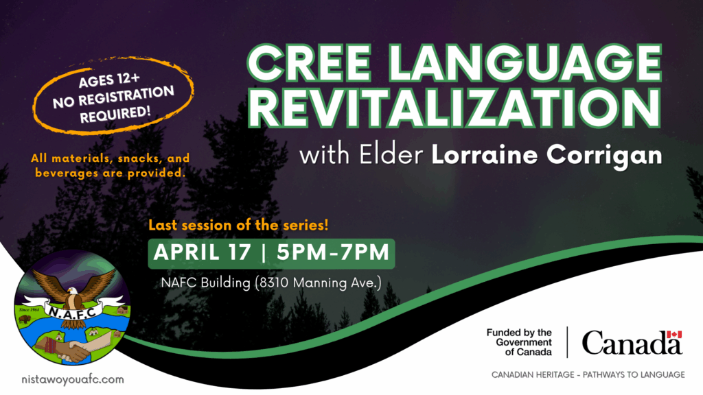 Community members are invited to join Elder Lorraine Corrigan for a series of Cree Language Revitalization classes at the Nistawoyou Association Friendship Centre. These sessions offer a warm, welcoming space to practice speaking Cree, listen to stories, and deepen your understanding of Cree traditions and the importance of language.