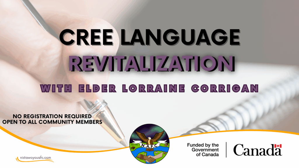 Community members are invited to join Elder Lorraine Corrigan for a series of Cree Language Revitalization classes at the Nistawoyou Association Friendship Centre. These sessions offer a warm, welcoming space to practice speaking Cree, listen to stories, and deepen your understanding of Cree traditions and the importance of language.