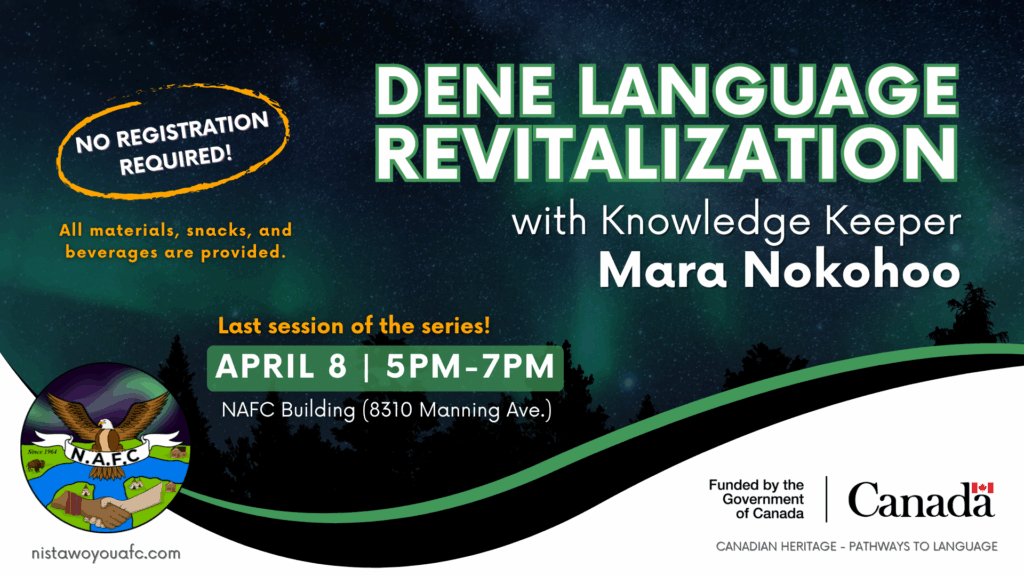 Community members are invited to join Knowledge Keeper Mara Nokohoo for a meaningful series of Dene Language Revitalization classes at the Nistawoyou Association Friendship Centre. Each session offers an opportunity to learn and practice Dene language through storytelling, conversation, creativity, and shared experiences.