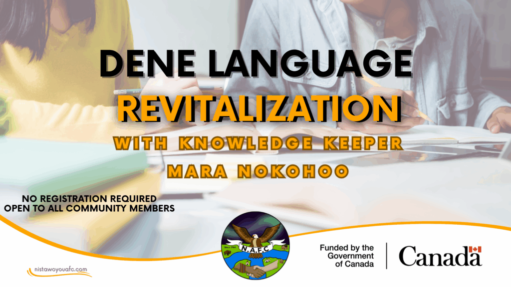 Community members are invited to join Knowledge Keeper Mara Nokohoo for a meaningful series of Dene Language Revitalization classes at the Nistawoyou Association Friendship Centre. Each session offers an opportunity to learn and practice Dene language through storytelling, conversation, creativity, and shared experiences.