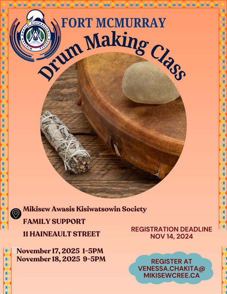 Hello MCFN families! Join us for a drum making class on November 17 & 18th.