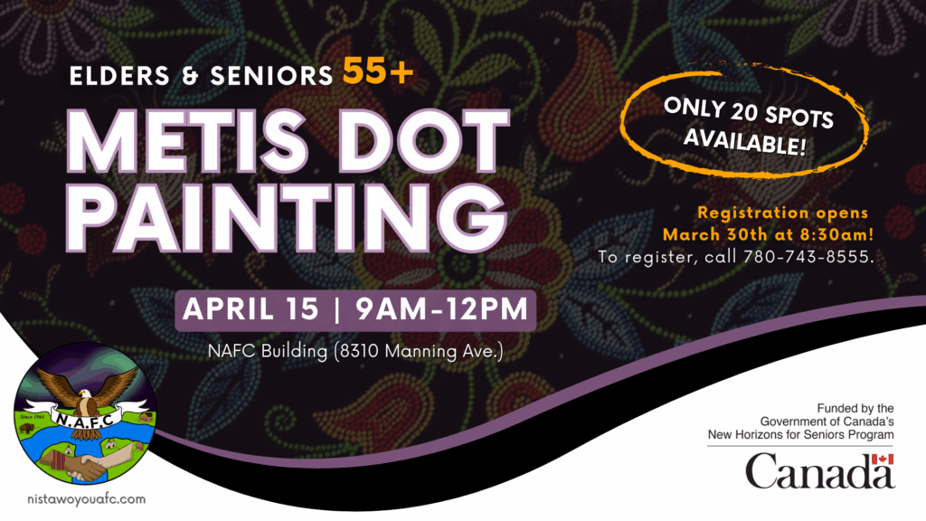 Elders and Seniors (55+) are invited to discover Métis culture through a guided Dot Painting Workshop. Facilitator Arlene Desjarlais-Wallace will lead participants through the history, meaning, and techniques behind this beautiful art form while creating their own unique piece to take home. All supplies and instruction are provided.
