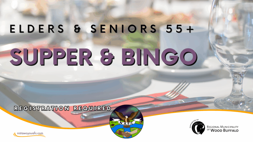 Elders and Seniors (55+) are invited to join us for an evening of food, fun, and community at the Nistawoyou Association Friendship Centre. Enjoy a warm supper, exciting door prizes, and a few rounds of BINGO to end the evening with joy and laughter. Doors will open at 5:00pm.