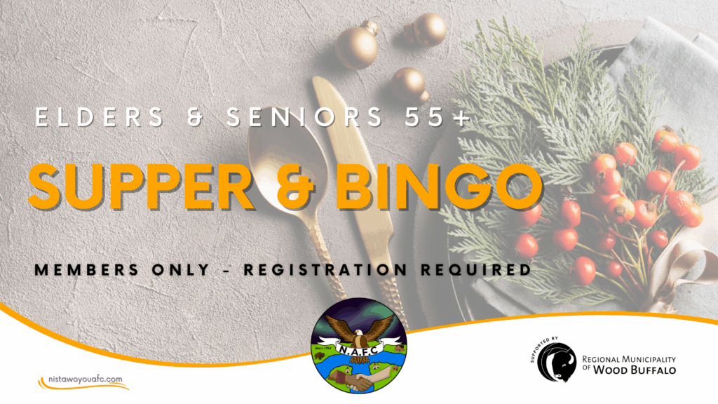 Elders and Seniors (55+) are invited to join us for a special evening of food, fun, and community at the Nistawoyou Association Friendship Centre. Enjoy a delicious supper, exciting door prizes, and a few rounds of BINGO to end the evening on a cheerful note. Doors will open at 5:00pm.