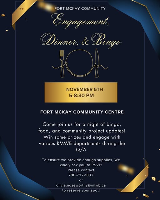 The RMWB Invite our community members to an engagement Dinner & Bingo. Come join us for a night of bingo, food, and community project updates. Win some prizes and engage with various RMWB departments during Q/A.