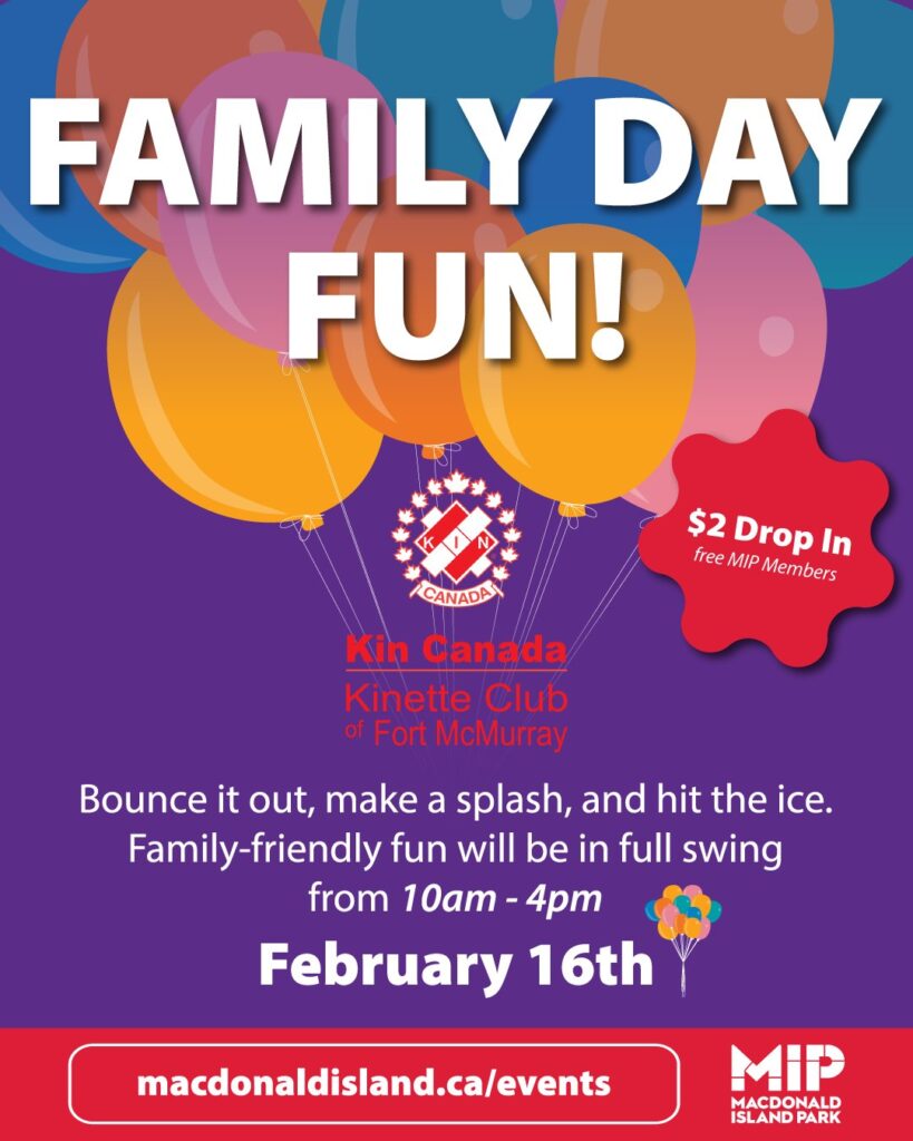 The Kinette Club of Fort McMurray has partnered with MacDonald Island Park to bring you our 15th Annual Family Day Fun event from 10am – 4pm on Family Day – February 16th, 2026. For only $2 per person (free for members) you can swim, go skating or the kids can bounce and slide on the 4 bouncy castles! Come enjoy a day of fun at MacDonald Island Park with your family!