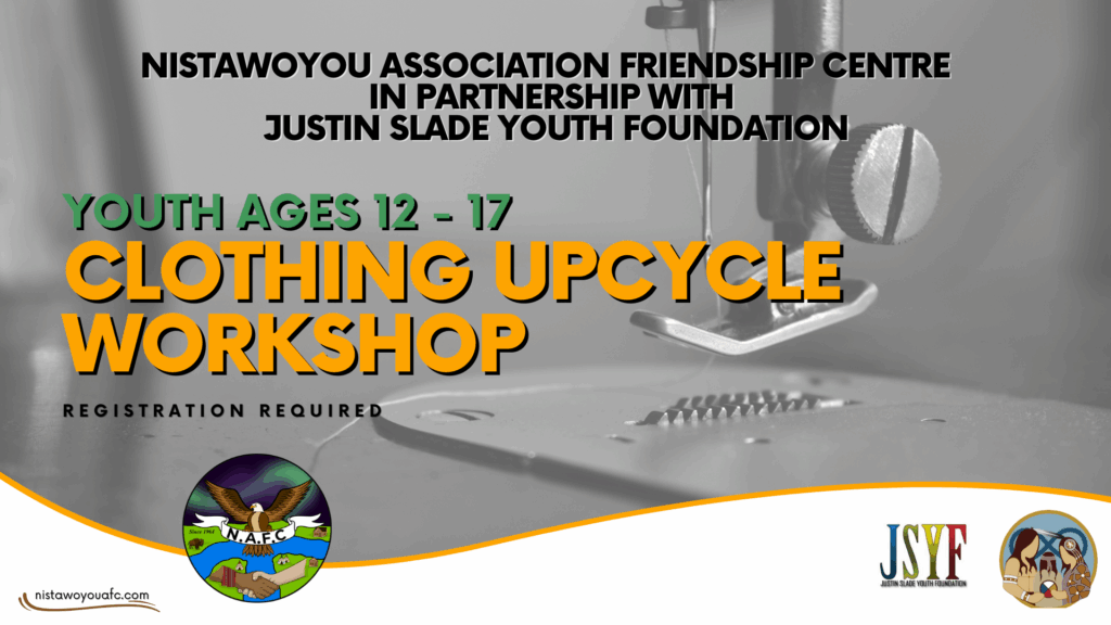 Youth ages 12–17 are invited to bring an item of clothing to refresh and redesign at our Clothing Upcycle Workshop. This creative session will run from 5:00–8:00 pm at the Nistawoyou Association Friendship Centre, with supper provided. Space is limited to 15 participants.