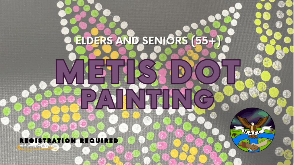 Elders 55+ are invited to discover Métis culture through a guided Dot Painting workshop at the Nistawoyou Association Friendship Centre, 9:00 am to 12:00 pm. This workshop will be guided by Arlene Desjarlais-Wallace. Participants will learn about the history and techniques behind this unique art style while creating their own piece to take home. All supplies are included.