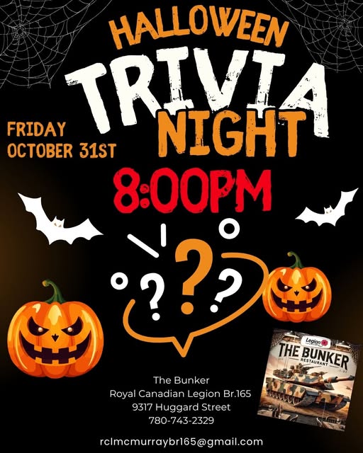 So Friday trivia night falls on Halloween this year so we’ll be doing a Halloween Themed Trivia that night and due to Halloween we will start an hour late at 8PM so people can take their little ones out trick or treating. Have goolish good time!! ![]()