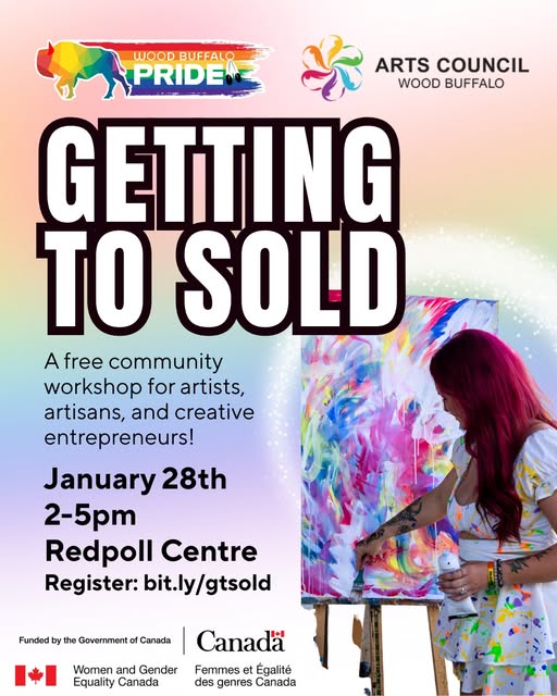 You’re invited to a free community workshop with Wood Buffalo Pride and Arts Council Wood Buffalo for creative entrepreneurs of all kinds! This workshop, delivered by Arts Council Wood Buffalo, will provide an overview for artists, artisans, and folks who create handmade goods on how to sell their work. This will include navigating business licensing, pricing your work and knowing your worth, branding and marketing.