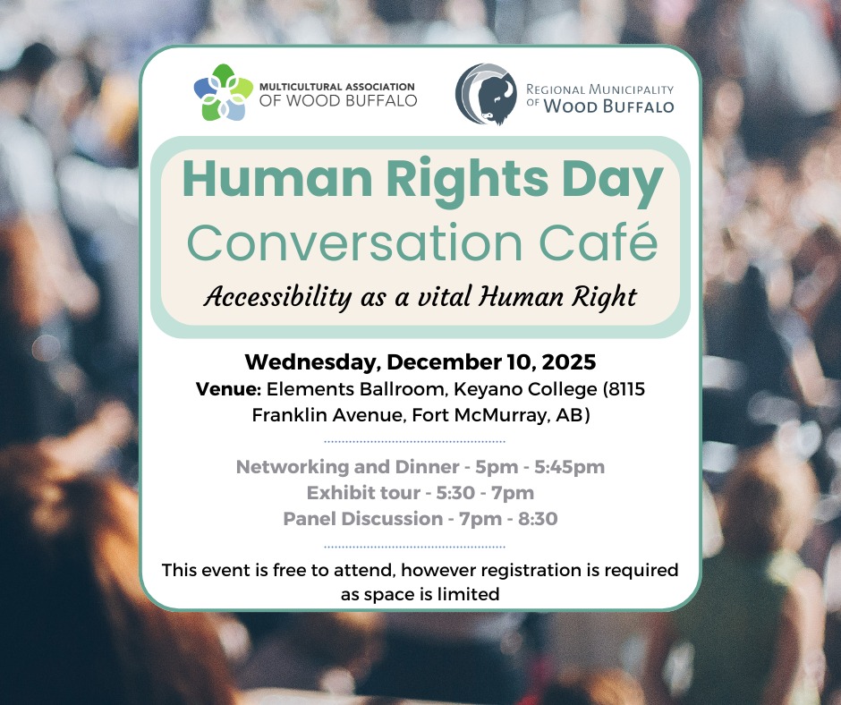 The MCA will be hosting a Human Rights Day Conversation Café in partnership with the Regional Municipality of Wood Buffalo to discuss the theme of “Accessibility as a vital Human Right”. The event will feature a panel community members top discuss the theme as well as a tour of the new Arts for Social Change Exhibit. This event will be a chance to have your voices heard on the issue of accessibility in the RMWB – let us know how you think accessibility can be improved.