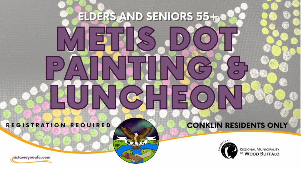 Please join NAFC for an afternoon of creativity and connection at the Conklin Multiplex in the Elders Room from 12:00–2:00pm. Participants will enjoy a Metis Dot Painting session taught by facilitator Melissa. This workshop will also include a Luncheon.