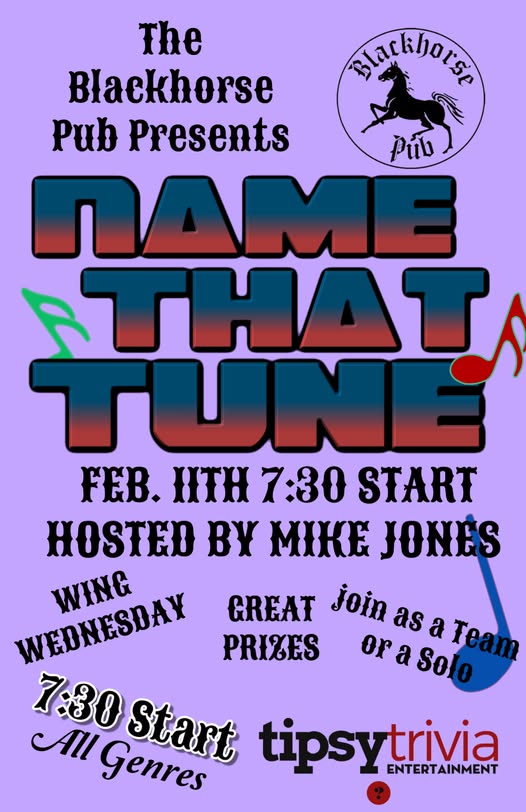 Join us at The Blackhorse Pub on February 11th at 7:30 PM for Name That Tune, hosted by Mike Jones. Whether you come solo or as a team, compete across all genres and enjoy Wing Wednesday specials. Great prizes await the sharpest music minds. Don’t miss out!