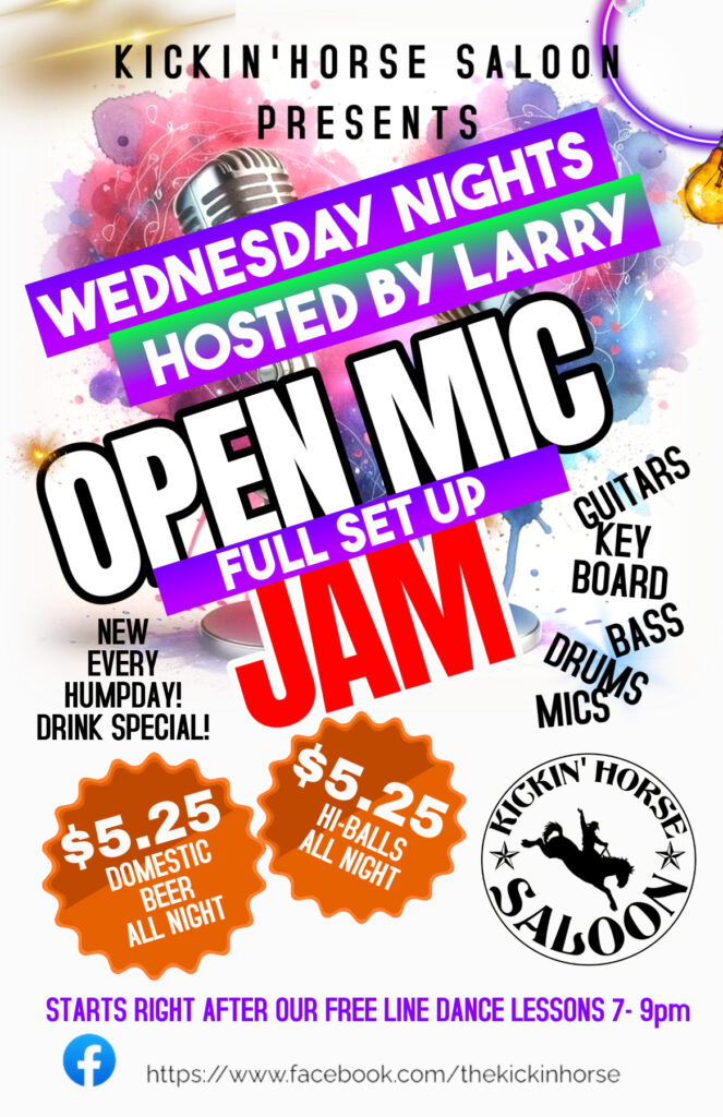 Join us every Wednesday night at Kickin’Horse Saloon for an open mic jam hosted by Larry. Bring your guitars, keyboards or bass quitar as we will supply the drum set. It can be full band jam session or come as a individual and just sing as Larry has you covered. Enjoy $5.25 hi-balls and domestic beer all night long. Starts right after our free line dance lessons from 7-9pm.