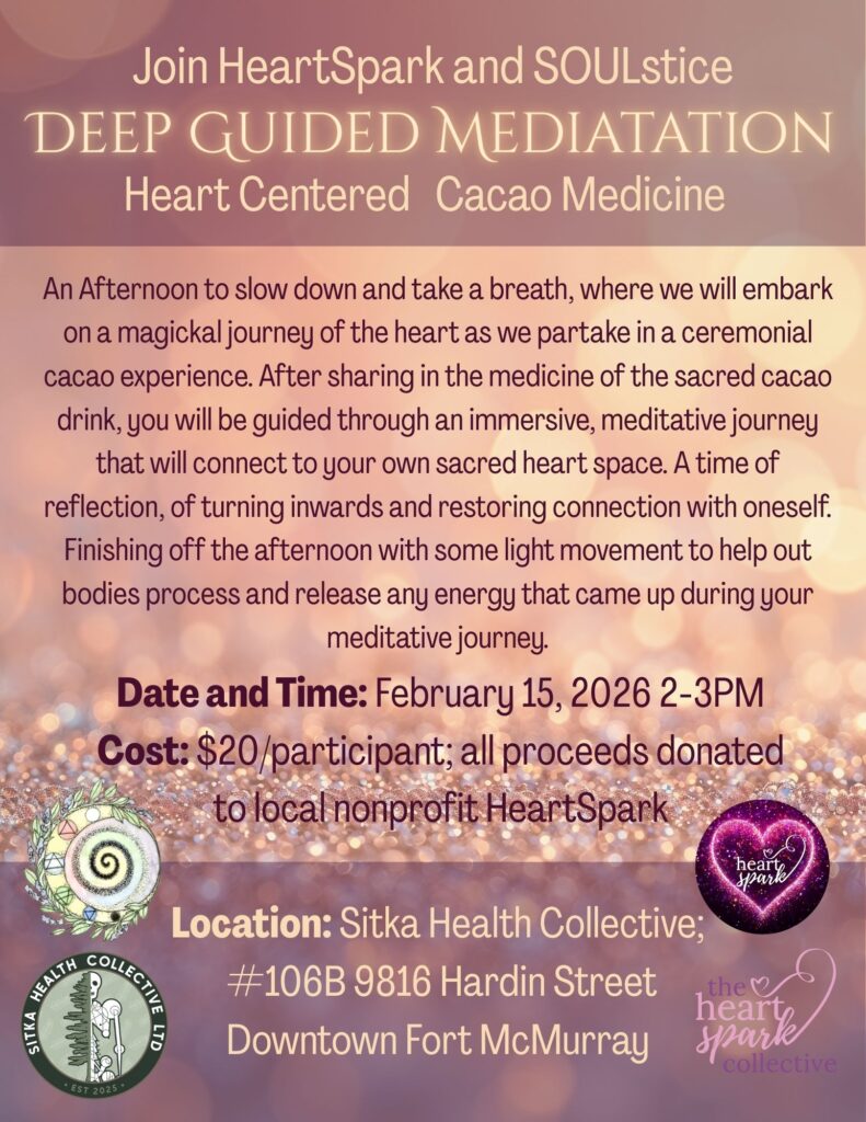 Join HeartSpark and SOULstice for an afternoon of heart-centred mediation. No experience needed. Females ages 10+. All proceeds donated to HeartSpark.ation: