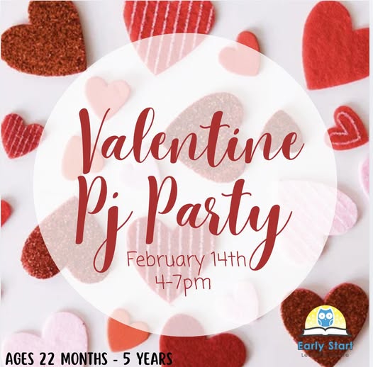 Join us for a Valentine PJ Party, February 14th from 4-7pm This event is designed for children aged 22 months to 5 years old, with NO potty training requirements.