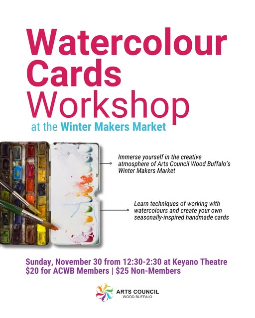 Join us for a cozy Watercolour Cards Workshop during the Winter Makers Market at Keyano Theatre.