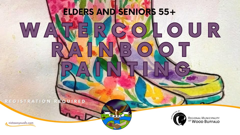 Elders and seniors (55+) are invited to join facilitator Rachelle for a relaxing hands-on workshop at the Nistawoyou Association Friendship Centre from 12:00–2:00pm. Participants will create a Watecolour Rainboot painting. All materials and instruction are provided, and no experience is needed.